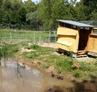 So I raised bird netting around the pond and we put the ducks inside their new duck house for 24 hours. I was hoping they’d imprint on it as home, especially since the fast-moving Mason Ditch is just on the other side of the levy from my pond. It went well for two days. The three ducks swam as if unperturbed by the watching pigs, sheep, turkeys and chickens, all of whom were fascinated by this new addition to our little farm. Then on the third night when I went to put them away I found the lone drake had disappeared. Just in case he’d flown over the netting, I clipped the wings of the other two.