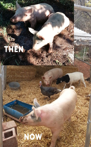 There’s no helper like a hungry piggy. She herded turkeys, climbed on bales of straw to watch me work and tried to poke her head through the chain link panel keeping her out of the turkey coop.