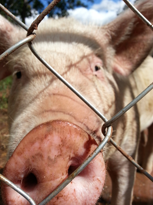 Speaking of the gilts, my little girls aren’t so little any more and are beginning to do some of the destructive things that hogs are famous for, such as breaking through the chain link panels that surround their little house. Boinker is culprit in this case. Given that she’s a little smaller than Oinker, she can still slip through the head-sized hole she opens in the chain link, leaving Oinker stuck inside the pen. This causes some riotous, blood-curdling squealing as I approach the back field with their breakfast. Oinker is terrified that Boinker might get to the food first, which, actually, Boinker usually does despite her smaller size. I’m sure my neighbors are thrilled with this dawn serenade.