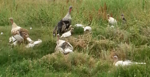 On the other hand, electric strand fencing has not proved effective for containing the sheep even though I ran three strands to almost 3 feet in height. Wool appears to be an insulator. That said, both of the sheep did touch their noses to the lines the other day. For the next four hours (which may be the limit of their memory) they avoided the lines and stayed where I wanted them. After that, they disappeared from their bit of pasture. I suspect they were grazing and, with their heads down, reached through the fence without connecting soft tissue to the line. Because there was no zap, they just kept going. Toby and Tiny seem to have bonded with the turkeys, because each time they’ve escaped, they’ve gone back to spend time with the birds.