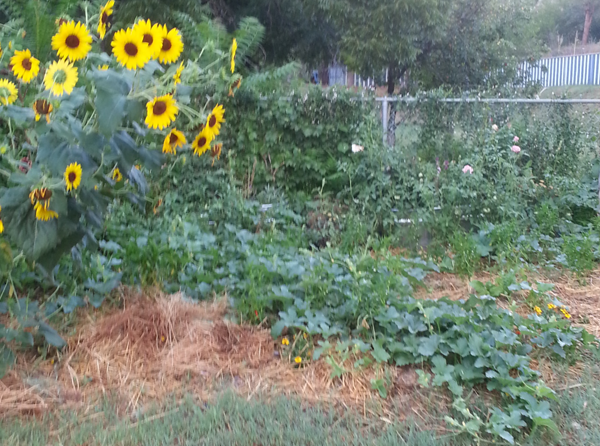 As for the storm, it’s circling and I’m hoping. I still don’t have A/C and the storms always make the temperature drop. They also bring the rains that have turned this place into a veritable jungle. For example, here’s a picture of that lasagna garden I started back in March. Today, the straw almost completely covered with Crenshaw melons, tomatoes and peppers. The sunflowers I transplanted and the roses I put in the tubs are going great guns despite the heat.