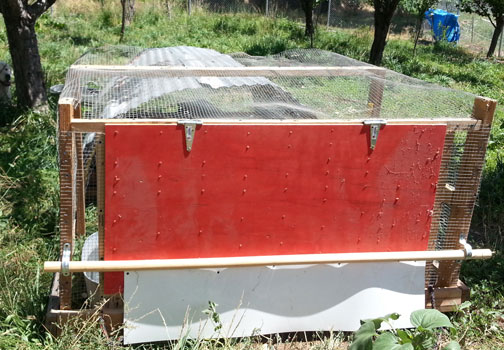The original tractor now has hardware cloth in place of chicken wire on the uncovered front as well as an attractive red door that’s wide enough to let a good sized hog pass. It’s not a sturdy piece of wood, so I went back to my roots and gave it the modern version of a Medieval door lock: a piece of wooden round closet rod held in place by braces.