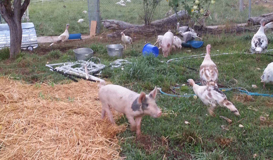 Other things worthy of note…both sheep and shoats love the bind weed! It’s their first choice for nibbling. After that, the shoats will move on to the plantain while the sheep go for the lambsquarters (imagine that!) All of them ignore the heavier, dense grasses and, thus far, the nightshade and the Italian Endive that I planted–no, not planted; I simply tossed out seeds–two years ago. Can’t say I blame them. The nightshade is thorny and the Endive is very, very bitter, like Chicory. It’s also incredibly persistent and is outperforming the nightshade. Since I’ve been told that hogs will eat the nightshade, I’m hopeful that they might also come to enjoy the Endive as well. The sheep like peaches, apricots, pluots and apples, especially if they’re a little soft. So far, the shoats have turned up their snouts to the fruit. I think this may be because they’re still taste-testing what’s being offered to them from the ground.