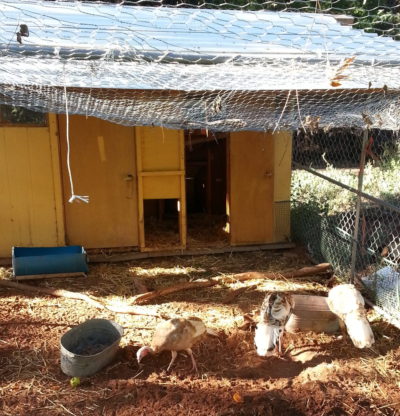 Included in the new pig enclosure is the little yellow turkey coop (the one built to handle my initial 20 turkeys). They love their new home. I opened the turkey-sized hatch for them their first night and found them snoozing in the dry straw the next, rainy morning. They came out to check on the food situation, then went back into their little home to laze until the rain quit. And they are in love with the dirt down there. Slowly but surely, they’re plowing through the lambs quarters and brittle bush while ignoring the Datura (Loco weed). They even eat the Goat Head plants!