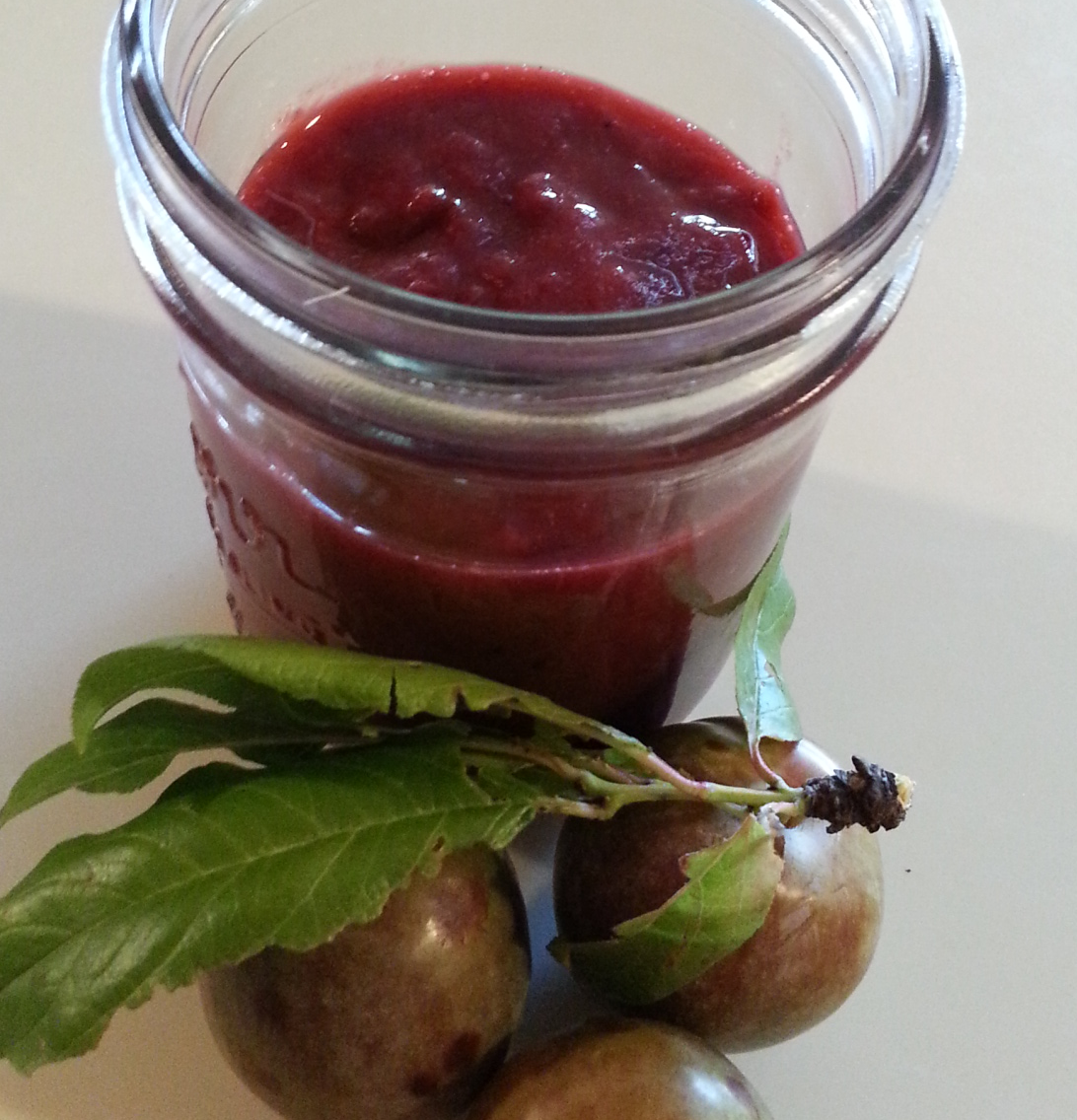 Combine all ingredients. Bring to a boil, then lower heat and simmer at medium low 35- 45 minutes, stirring occasionally, until plums are soft. Remove from heat and let cool 10 minutes. Remove cinnamon stick, puree. Fill sterilized glass 1/2 pint jars (that’s basically one serving), wipe rim, fit with canning lid and ring, screwing lid on until it’s almost tight. Stand upright in a pan of boiling water, the level of which is 3 inches higher than the jars and to which 1/4 cup of white vinegar has been added (prevents unsightly crusty build up). Keep water boiling for 10 minutes, remove jars and set them on a cloth-covered counter top. Check for a solid seal after the jars have cooled.