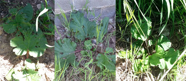 The middle one is twice the size of the others. Victoria, I thinkI no longer know what two of them are. Something–snails, gophers, cats, turkeys, who knows–ate the stakes I put in next to those plants. The one doing the best still has its tag: Victoria. It’s already twice the size it achieved last year, sporting three nice long stalks with well-developed leaves and plenty of new leaves. The stalks are a beautiful red hue. Oh be still my heart! Yelly might just be possible this year!