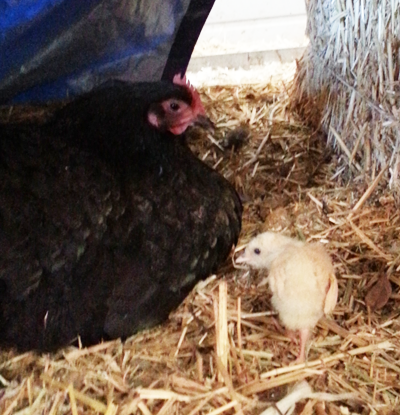 I returned this morning to find the baby chipper and interested in my finger. So, food and water has been left within reach. As of this picture-taking, mother and baby are doing very well. Now, to keep Moosie out of that coop!