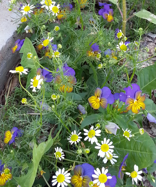 Chamomile and ViolasA few years back I planted an Elderberry hedge, and since then its blossoms have become a favorite for my impromptu bouquets. White, wide and lacy it’s perfect in a mason jar with a couple of roses. So is Chamomile, which I’m hoping takes off this year. I started it last year near the commercial kitchen door and let it go to seed. Much to my pleasure, dozens of plants reappeared this year. I’m hoping to collect seed this year and spread it throughout my gardens. Because it’s such a pretty little daisy-like flower, I love adding it to gardens for its look, but drying the flowers for tea is also high on my list of uses for it.
