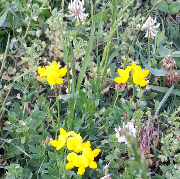 Now this next one I’m sure is also an orchid, but I can’t figure out what it is. It looks to me like the “Lady Slipper” orchid I’ve seen in the Midwest except those are pink while this is a beautiful bright yellow. It’s scattered all over my pastures, poking up from the sea of white and red clover that’s attracting bees like crazy–so much so that I don’t dare walk in it without closed shoes on. These little yellow flowers have that orchid face with a pouty lower lip.