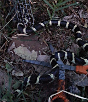 Meanwhile, last night as I was walking back from closing up the chicken coop, Moosie stopped to investigate something. My first thought was that it was a poult left behind by its mama. It wasn’t. It was a king snake that had somehow managed to shove itself through the layers of bird netting and hardware cloth I’d wrapped around the trunk of my ditch-side peach tree. Beaver protection. Now, I haven’t seen a beaver since the creek changed course, sending most of the water around the opposite side of the island. I armored that trunk after that beaver took 1 nectarine and 2 peaches and forgotten it. Since I love King Snakes–not only are they beautiful but also hard workers–I wasn’t about to let it die, I got my gloves, scissors and wire snips and went to work. It took almost a half an hour to free the poor thing. He/she wrapped him/herself into a knot as I carried it into the fenced garden where Moosie couldn’t play with it. It was gone this morning, so I’m choosing to assume it went under its own power.
