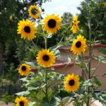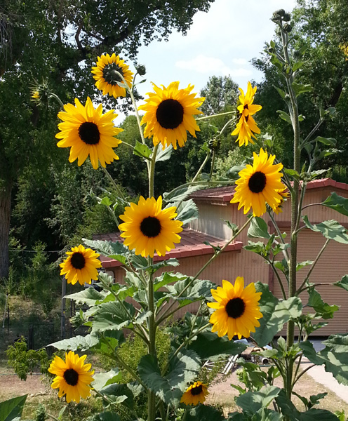 SunflowersI don’t think I could live anywhere where my favorite summer flower couldn’t grow. I don’t just love sunflowers because they’re beautiful, but because they’re so helpful to a gardener. They’re a trap crop for aphids and they attract Lesser Goldfinches, ladybugs and praying mantis. The Lesser Goldfinch is a sweet social little bird with a dark back and yellowish belly. They come as a flock, peeping and talking to each other, as they dart through the garden eating bugs, then retreating into the sunflowers to dine on aphids and cut round patches from the leaves to line their nests. They very quickly get to know me and don’t mind it when I’m working right next to them. As for the sunflowers presently growing on my property, every one is a volunteer from previous years, spread by the birds. Some have lost any of their parents’ hybrid drama while others still retain a bit of grandma’s pizazz.