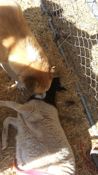 All of a sudden, the coyote was crying and retreating. From the sound of it, blood had been shed. Both dogs met me a moment later. It wasn’t their blood. I breathed in relief and hugged the Bear. Apparently, lambs bring out the best in him.