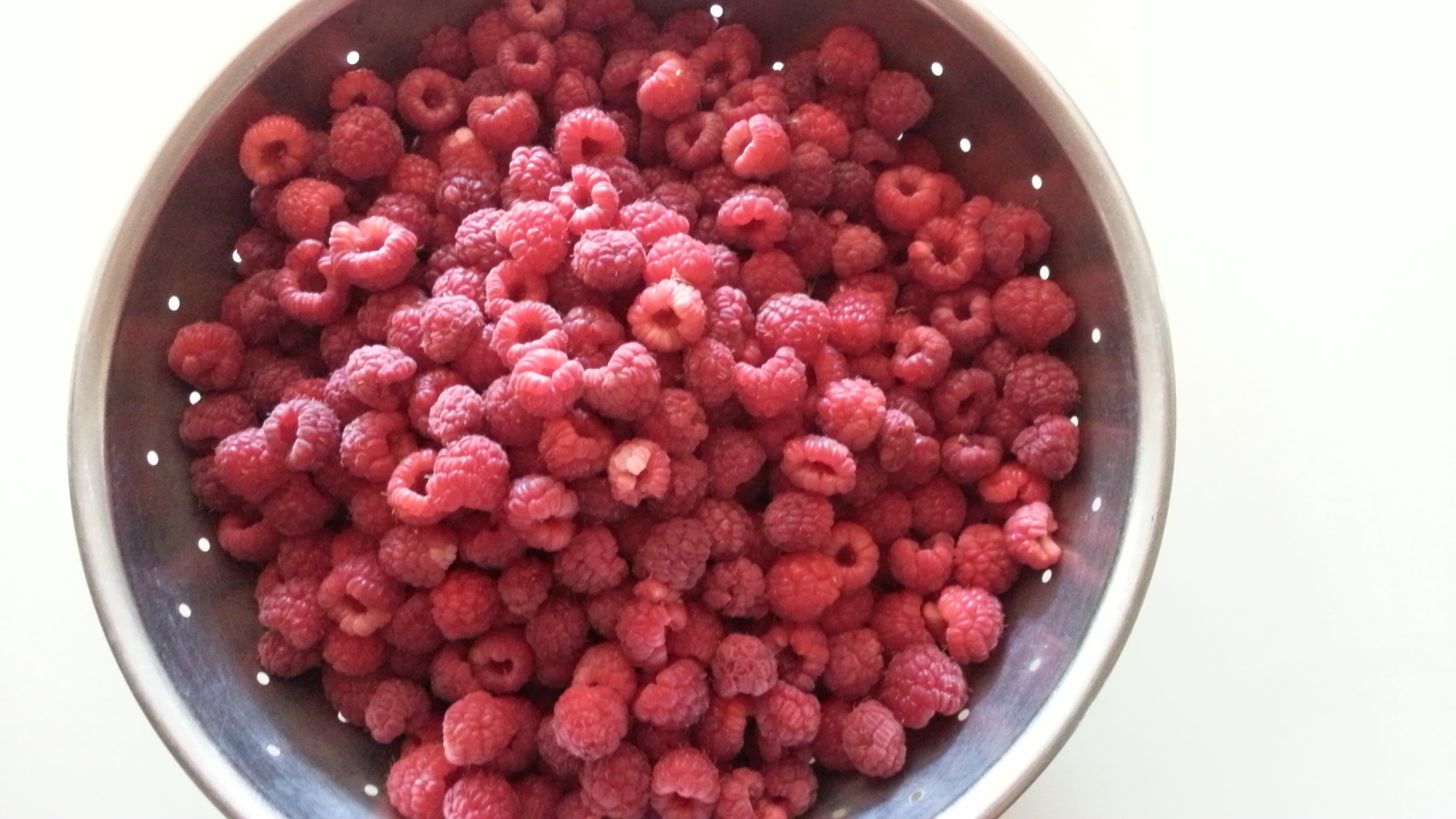 es, they’re an ever-bearing variety, so I’ll be harvesting all summer. I got about a fourth of the hillside harvested yesterday morning, and this is what I came in with (about 2 pounds). I see Raspberry Shrub/Vinegar in my future! That, and I bought this great Rousanne from Page Springs Cellars as part of celebrating finishing the book. I think around 7 PM tonight, after it’s cooled down a little, I’ll throw a handful of razzle into my wine glass and top it with some dazzle. Porch wine time!