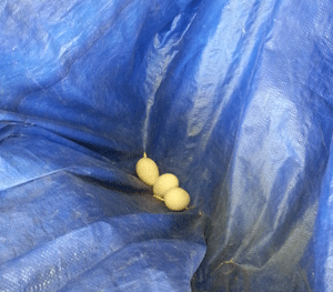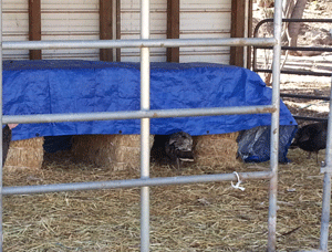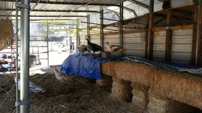 Along with laying in the roosting coop, the girls are beginning to get serious about the newly created nesting coop. You can see the front of that area in the Moosie picture. It’s what used to be the cow stalls. I even left all the layered, manured straw in place. Surprisingly, it has the sweet smell of compost rather than that of cow bombs. So far, that seems to be pretty enticing to soon-to-be moms. Not all of them are using the spaces I created by stacking straw bales. I have two girls who’ve decided that crinkling tarp is better than sweet straw. One is using the crease between bales while the other has three eggs in a tarp sling between two bales. I wonder if it will sag all the way to the ground when she hits the usual 12 to 15 eggs.
