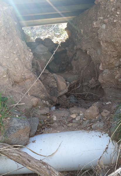 Both bridges are necessities, but especially bridge #1. It is strong enough to withstand the force of monsoon season rainwater that torrents down the hillsides above me, through the gully that starts at the top of the property, then under (and over, actually) the bridge, until the cataract shoots into the Mason Ditch with enough force to send it tumbling out of its banks. I’m certain that when Sam first installed the spring pipe it was all at least 6 feet under ground. As you can see from the picture, the pipe remains 6 feet below ground level…the ground’s just gone missing. You can see the base of the bridge above it. I’m going to have to get going on a plan for doing something about this, and soon. There’s only 4 days left before the water’s off.