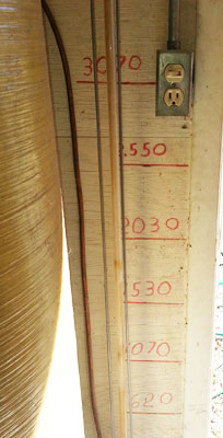 Next, I learned that a 5000 gallon tank isn’t a 5000 gallon tank if it’s filled with 1000 gallons of sediment and your pump stops pumping at 1500 gallons. For the record, the tank has an electrode that shuts off the pumps and pressure tanks when the water tank reaches just above 500 gallons, or so the writing on the wall (literally…it’s written on the pump house wall–see the picture) says. That means when I thought I had 5000 gallons in storage, plus an additional 3000 in the back up tank, I really only had 3500 in the big tank. And, only 3000 of that was usable. So before the spring ditch shut down, I had calculated on 500 gallons per day house usage taking us all the way through the ten days. Bless them, all of the souls who now come and go from this place managed to maintain that usage.