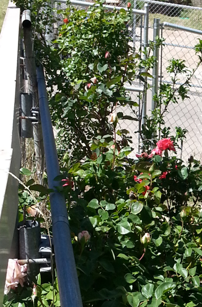 The roses went in. On my side there are three pink roses and a Thompson grape, which I hope will crawl across that chain link fence. Elana also went with roses, a fragrant purple one that is already blooming and a red. I mulched from the pile of leaves that was created as I cleaned the spring all winter long. Worms love those leaves, so I know I’ve already inoculated my new planters with plenty of the little earth eaters.