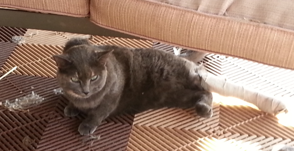 [image error]As for my other successes this week, first Shy Girl. She’s healing nicely. That’s the success. The downside is that she’s healing nicely, which means she’s become a very fast hobbler and one very determined escape artist, even though that splinted leg slides out from beneath her. The vet commanded me to keep her confined and calm. Right. Not happening. If I keep her closed into the bedroom, she waits under the bed then sprints for the door when I open it, darting between my legs and heading for the nearest, lowest chair in the living room under which to hide. She likes sitting in my lap as I write, but if I get up to let in some other half-housebroken creature, she’s vaulting through the air for the doorway. Once outside, she hops from this to that like one of the extreme urban athletes who look like Spiderman as they leap tall buildings in a single bound. And she knows exactly where to go so I can’t reach her. Worse yet, she continues to refuse to use the inside litter box. She wants her usual dirt patch and nothing else will serve. However, putting her out in that stinking plot–she’s not the only one to use it, but they do confine themselves to that one patch so I’m okay with cleaning and refreshing it from time to time–means letting her out of my grasp. No touching is allowed while evacuating her bowels or bladder! Just as she’s burying what she’s just left, she slants a look that says, “Catch me if you can,” and off she goes. So far I have been able to run her down, but as she continues to improve this may change. Oh look! A new Crossfit exercise: three-legged cat wrangling.