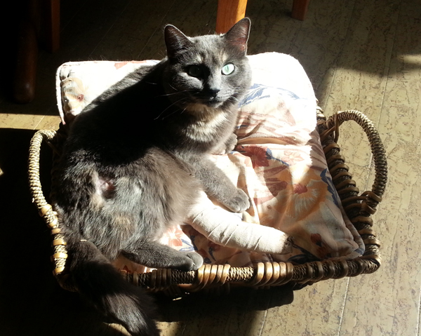 Then, long after I’d gotten far too attached, Shy Girl appeared, dragging her back leg. It was the same leg that her sister had lost after dislocating her hip. This time, I saw a different vet who simply (!) ground down her hip socket and the head of her femur, then let her muscles compensate for the missing bone. Eight days after the surgery, Shy Girl caught a mouse in the basement. Wow! That was two years ago now and she doesn’t even limp.