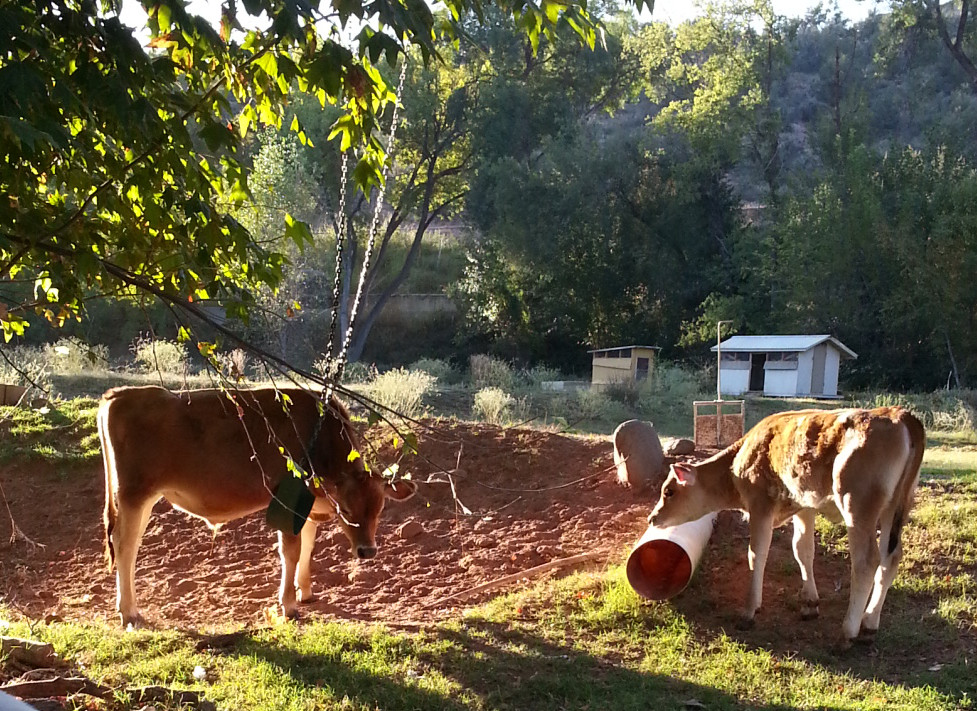 Think I’m wrong about that? Then you haven’t watched one of my four-legged babies play. Dog or cow, they recognize a toy or a playmate when they see one. The swing is a favorite. Every calf that’s lived here long enough to discover it has developed his own game with it. If you headbutt it just right, it’ll go swinging and twisting and hit your buddy in the back. That’s the best fun!