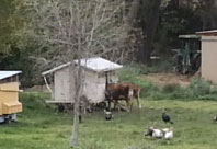 Hamburger and Hamburger’s HelperSorry about missing the second post last week, but I lost control of my life. As always happens when I do that, sprockets spring, springs sprocket and colored streamers and confetti explode out of my head. At least it was a somewhat productive breakdown. First, Moosie succeeded in teaching Hannah Mae how to dig for gophers. This has been his mission with each and every calf here. And each calf has indeed stood next to him while he digs, watching in fascination, including Hannah. It’s like they’re saying to him “Oh, yeah! This is fun. We’re having fun, aren’t we? But what exactly are we doing?” On Friday, while I was herding turkeys into the coop, I caught Hannah pouncing over and over on a pile of loose dirt stirred up by the dust-bathing turkeys. She was lifting onto her back legs then bringing both front legs down with pretty decent force as she tried to kick the dirt out behind her. It took me a moment recognize “cow digging”.