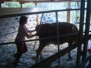 nk you Gail and Bob Haugland) that prevents cow intrusion–as long as I keep the door closed. I had it open for an instant when I went inside to retrieve food pans and Elsie dashed through the opening. That’s me shoving her back out of the door. After that, you should have seen the cows studying that door. I think Georgie even considered getting on his knees but swiftly realized that cows can’t crawl.