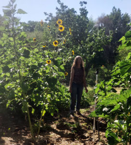 Before I talk turkey I want to offer a garden update. Between the high temperatures and me remembering to water, the first of my all-volunteer sunflowers are now over eight feet tall. I’m in the picture to give you perspective. Because most of my sunflowers are volunteers I doubt any of them will have the single broad head of their parent, which was the Evening Sunset Sunflower. I love that sunflower for its bright red petals. Instead, this second or even third generation will sport up to a half-dozen smaller flowers in all colors from the bright yellow of a traditional sunflower to yellow flowers tinged with rust to a few that are streaked with red and yellow. Not that the color of the flowers matters to the Lesser Goldfinches. They are the reason I encourage the sunflowers to volunteer year after year. These tiny yellow-and-black birds use the sunflower leaves to line their nests, eat the sunflower seeds right out of the heads, and, in the space between flowering and seeding, eat the aphids in my garden. It’s truly a win-win for everyone but the aphids.