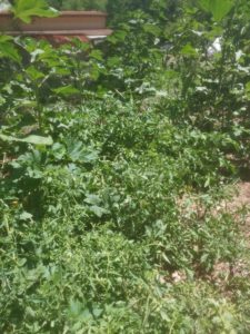 This picture is of my garden. There are Better Boys, started from six-year-old seed, purchased Romas, more Cherokee Purples and some Yellow Pears which seem to be succumbing to the Verticillium. That’s odd for Yellow Pears. They’re usually indestructible. There’s also some other potato leaf tomato variety in there. Unfortunately, I can’t recall the name. Maybe when I see the fruit, it will jar my memory.
