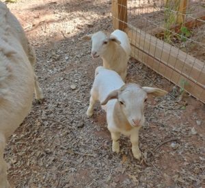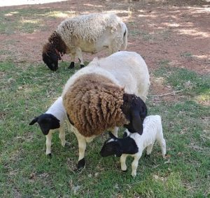 They’re a week old now and the golden girl is still dominating her brother. Three days ago, Rosie dropped two little girls without any help at all, God bless her. These are proper Dorpers, with black heads and white bodies.