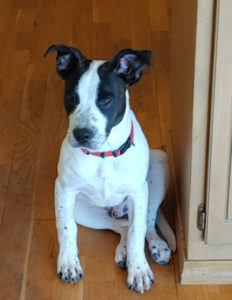 We were both disappointed. Not only was the puppy “shy” (that’s another way of saying “feral,” I think), but her unnatural crouch practically screamed hip dysplasia. Startled–because I was sure I was supposed to find “the dog” here today– I put Radha back in the truck, then wandered through the kennel area. None of the dogs felt right. Once back in the lobby, I glanced over at a glassed-in cubicle. In it sat a black-and-white puppy. Actually, I thought he looked like Nipper, the old RCA mascot, or maybe a Jack Russell Terrier. As I watched him, he met my gaze. There was brute intelligence in those eyes.