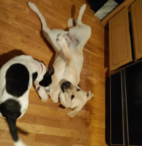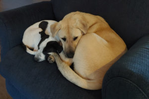 Not that little Rupert won’t assure me constantly that he’s starving. With each day he gets stronger which means he and Radha play harder, going full out until they both drop. Dropping means time to cuddle. Yes, that sign was indeed an omen and I came home with the right dog.