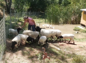 As for Milly, after the trauma of giving birth to her “Blackleg”– this isn’t a name, just what I call him because the black color from his Dorper head spreads down his front left leg to his hoof as if he were wearing one black stocking– has turned into a wonderful mother. Like Mari, who is Milly’s mother, Milly keeps her child close and safe. Although he was the last born, he’s now second biggest, next to Tiny’s albino boy.