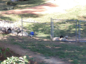 You may note in this photo that Kali is wearing her training collar. That’s Mr. Headbutts’ fault. That sheepish little imp just loves to whop the puppies with his head, then race away, daring them to chase him, which they cannot resist doing. Unfortunately, none of the other lambs are as excited about this game. I warned Mr. Headbutts that he has to stop that or I’ll be putting that collar on him.