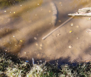 Guess what I found in the brooder coop the next morning? Three duck eggs! I gnashed my teeth at how the puppies had cheated me over these months then went on with my day. Later, when I was walking past the pond, I noticed that the water level was very low. Then I noticed that the water was clear for the first time since I let the ducks live on it. (I also grimaced as I saw the piping and poles that are now permanently embedded in the pond bottom, held in place by a thick layer of muddy clay. I and others have tried to remove them more than once, but they won’t budge. But that’s another story.)