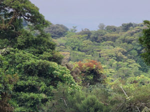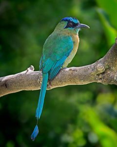 Motmot birdAn Agouti (half-rabbit, half-rat) showed up, as did a Coatimundi, and on the final day, an orange-and-black tarantula made her way under the house. There were Brown Jays in the treetops, Fairy Wrens dancing around the front porch, sweet little black-and-white thrashers, and a small flock of parrots that flew past us morning and evening. Later in the week both a Toucanet and a Toucan, the one we all expect, showed up. We walked in all three nearby reserves where the three-wattled Bell birds were calling, their call being a metallic “bonk” followed by a squeal that sounds like a gate in need of oiling, and white-headed Capuchin monkeys.