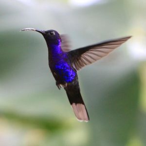 Violet Sabrewing HummingbirdAfter we settled in, I filled the available hummingbird feeders. Within moments there were at least 7 different species vying for sugar water, including a tiny orange-and-green one whose wings beat so fast it sounded like an angry bee. Another was bright green with a speckled green breast, and there was one that looked black until the sun hit it then it gleamed either bright blue or emerald green, depending on the angle. But my favorite remains the Violet Sabrewing. It’s about the size of a sparrow and beats its wings very slowly. Later, a pair of Bananaquits, a tiny little yellow and brown/black bird, came to rob syrup from the feeders, darting in while the hummers were busy trying to drive each other off. A pair of dark-colored, blue-billed Guan, a turkey-sized bird, showed up daily to entertain us with their ability to walk out to the twig ends of branches. They shared those trees with the gorgeous Motmot bird, which says “mot-mot.” Surprise!