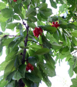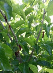 On the eastern end of that same hillside are my Pakistani mulberries. They were planted in 2014 and were supposed to be bushes. Instead, they’ve become bushy trees. They’re covered with 3 to 4 inch long dimpled fruit. They look sort of like a very long blackberry and are without a doubt the best tasting berry ever. Well, until the raspberries come in, that is. Of course, by then the mulberries will be gone. Everything in its own time.