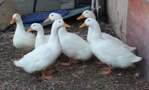 The Pekins turned out to be interesting to raise. First, I’m surprised at how bonded they are to each other. Not even my turkeys are like this. If one of these shiny white guys moves, all the others move with him as if they’re somehow strung together. A few weeks into their life here, I traded out their little water basin for one of the pig troughs. They loved it. They got in and out so often that I had to change the water twice a day due to mud build up. Even though they acknowledged me as the official feeder and water renewer, no matter how many times I entered their run, they acted like I was the local ax murderer.