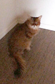 At two weeks, Molly apparently got tired of being a coward. She ventured boldly out of the bedroom and went straight to the living room where the other cats usually spend their day, moving from chair to floor as they follow the sunlight. I followed, ready to referee if necessary.