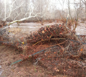 It wasn’t until the water finally fell below five feet that I realized why my property flooded. Until then, I couldn’t see the opposite side of the creek. A thick line of trees fills that bank and over the course of the flood the water had woven whole trees and giant branches between them until it looks like a wall made of basketry, then coated everything with piles of silt. The opposite bank is now 15 feet taller than my side of the creek. That left the water nowhere else to go except onto my pastures.