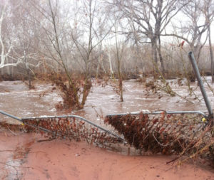 I breathed too soon. The rain started around Monday, then stayed steady. I gritted my teeth and kept my fingers crossed, only to gag on Wednesday when I saw the USGS (United States Geological Survey) warning predicting 13 feet Thursday night/Friday morning. That put the water level over the top of my middle pasture fencing! I spent the day pulling up all the temporary fence I could, then went to bed praying the government had gotten it wrong.