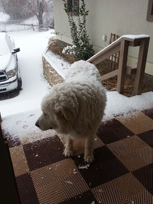 However, in the spirit of fairness I informed Bear, my 135 pound Kuvasz, that he was in for a treat. In the breed description for the Kuvasz it proclaims that the dogs are “almost impervious to inclement weather” and Bear is exactly that. I didn’t bother to tell the sheep snow was coming. They, like Bear, are also impervious. However, I did warn Tom the Turkey that he and his girls were going to have to spend time in jail even though they hadn’t done anything wrong. That is, other than walk all over our vehicles. The hens make a daily trip up here to visit a French door I have stored under the house. I suspect they see the angled door as shelter and the space between the door and the wall as a safe place to lay eggs, which of course it isn’t. The dogs love to eat turkey eggs.