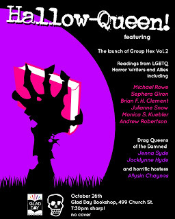 So there you have it! Readings and dancing from some of Toronto's finest talent! Come on out or if you can't come out, consider buying a copy of Group Hex 2 and donating a buck or two to Good Job Sally!