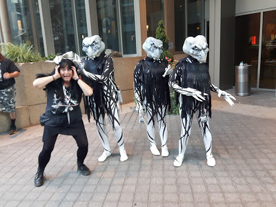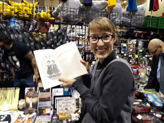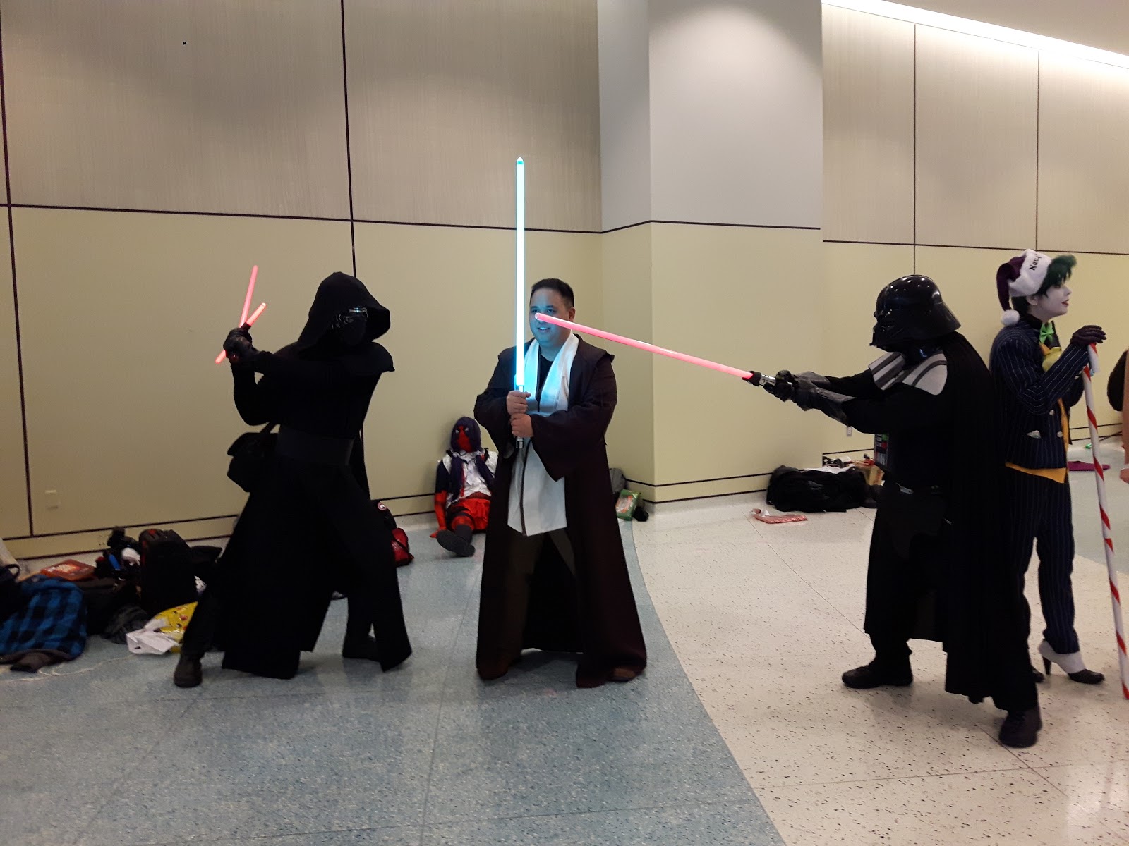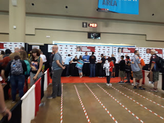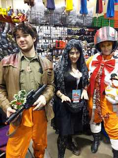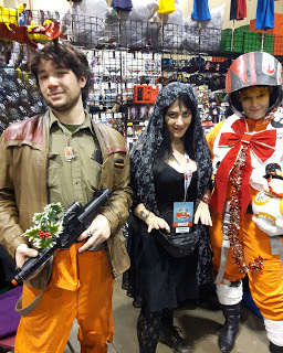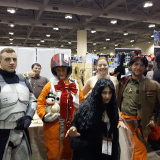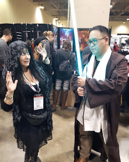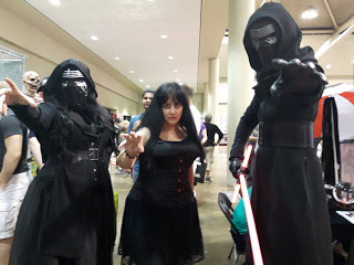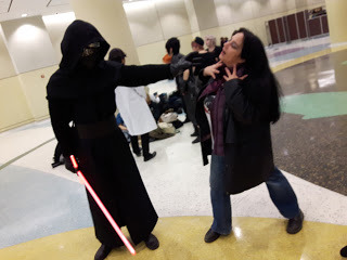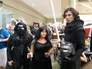 There were no Kylo Rens coming through the dealer's room. There were a couple of people who I thought might be Kylo Ren but also could have been any number of black hooded characters with a saber. I know a lot of video game and comic book characters but certainly not all of them. There were a couple of lady Kylos but they never came by my actual booth. One was really cool and I should have taken her picture. She had black Rey hair, black Rey outfit, Kylo scar across face, and red saber. I liked that interpretation of characters. I also thought I saw, before the show began, the lady Kylo Ren who is in a picture on another post in this blog but she never came into the dealer's room. I began to realize that a lot of cosplayers weren't going into the dealer's room around two or three o'clock but it was a very long hike to go watch them all posing for photos and playing on the different floor levels, looking for my Kylo Ren and I needed to be near the booth! Surely there was a tall, adult Kylo Ren cosplayer who would like to play with me somewhere at this entire convention of cosplayers?!