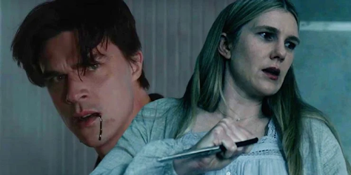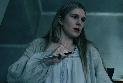 The Harry storyline goes full Rosemary’s Baby in this final installment with several moments paying homage to the iconic film and famous scenes. Doris (Lily Rabe) hearing voices and walking into a room of conspirators. The blue nightgown butcher knife homage right from Mia Farrow’s trembling hands. The paranoia that something isn’t right, that everyone around Doris is different somehow and she’s trapped in a nightmare where she can’t escape.