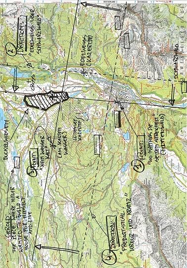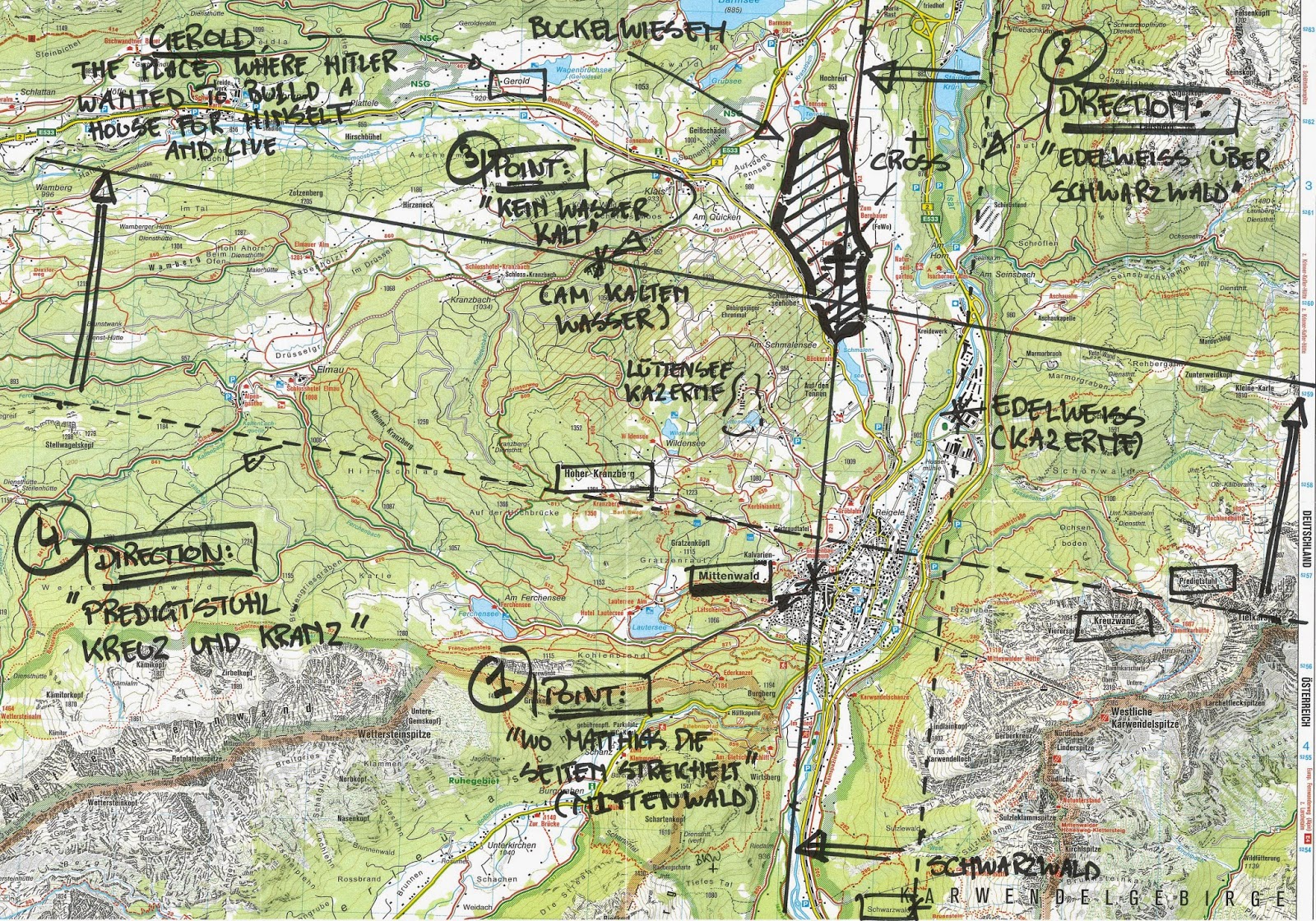 Vervolgens trekken we een rechte doorheen het punt dat beschreven wordt in ‘Kein Wasser Kalt’ in de richting die beschreven wordt in ‘Predigtstuhl, Kreuz u. Kranz’. We gaan na waar deze twee rechten elkaar kruisen…
