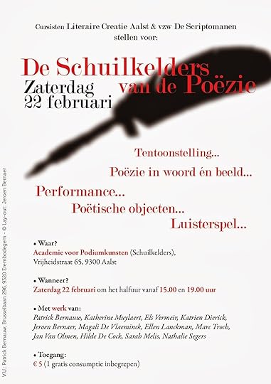 De Schuilkelders van de Poëzie· Waar? Academie voor Podiumkunsten (Schuilkelders), Vrijheidstraat 65, 9300 Aalst· Wanneer? Zaterdag 22 februari om 15.00, 15.30, 19.00 en 19.30 uur (vooraf inschrijven is wenselijk en kan via patrick.bernauw@gmail.com). De Schuilkelders van de Poëzie zullen van 16.00 uur tot 18.00 uur ook geopend blijven en toegankelijk voor het publiek. · Toegang: € 5 (1 gratis consumptie inbegrepen)· Met werk van: Patrick Bernauw, Katherine Muylaert, Els Vermeir, Katrien Dierick, Jeroen Bernaer, Magali De Vlaeminck, Ellen Lanckman, Marc Troch, Jan Van Olmen, Hilde De Cock, Sarah Melis, Nathalie Segers