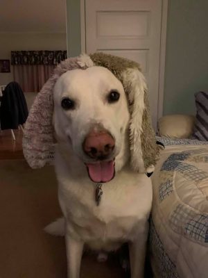 Duke wearing his flat squirrel (that we call Roadkill) as a hat…Lab fashion is not for everyone…