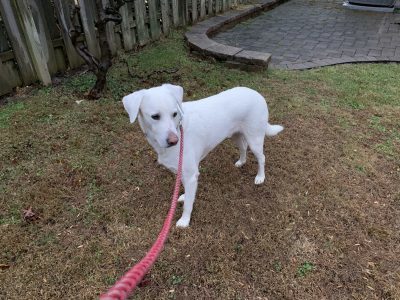 Among the attached photos, I included one in the backyard, so you can see just how white he is.