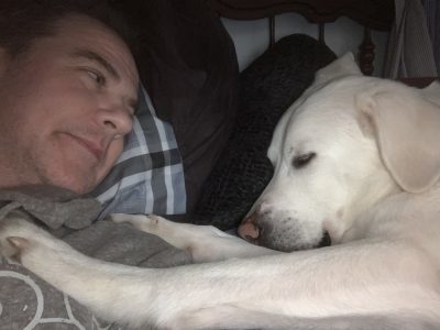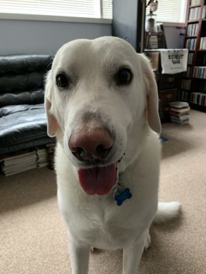 It was one year ago today that we adopted Sir Duke, the yellow (white) Lab. The next day, he got skittish and ran away for 21 hours, finally making his way home (sort of: wrong house, right street) on his own.I asked Duke to comment on his anniversary, but he was too busy gnawing his celebratory bone (filled with beef); it’s very thick & smells like, well, dead cow.